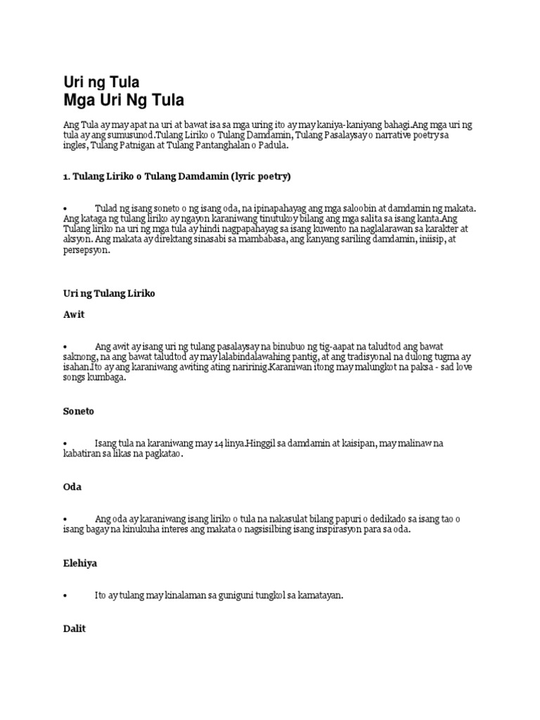 Ang paksa ay higit na personal sa. Ang Tula ay may apat na uri at bawat isa sa mga uring ito ay may kaniya-kaniyang bahagiAng mga uri ng tula ay ang sumusunod. Ang damdamin o emosyon ng makata laman ang naging konsiderasyon sa pagsulat ng uri nito.