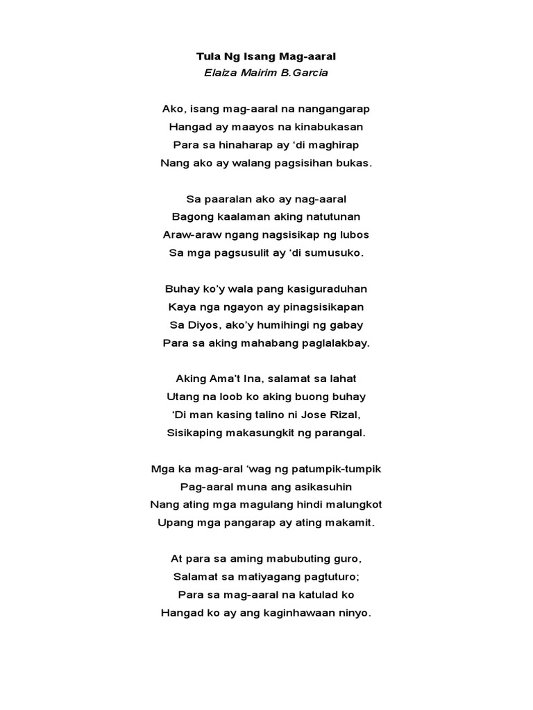 Sa Aking Mga Kabata Kapagka ang bayay sadyáng umiibig Sa kanyáng salitáng kaloob ng langit Sanlang kalayaan nasa ring masapit Katulad ng ibong nasa himpapawid. Ang pahayag na ito ay binuo upang mabigyan ng angkop na paliwanag ang tungkol sa mga Tula ng wika. Makatulong nawa ang mga sumusunod na tulang ito at maging pundasyon upang mas lalo pa nating pag-alabin ang ating pagmamahal sa ating sariling wika.
